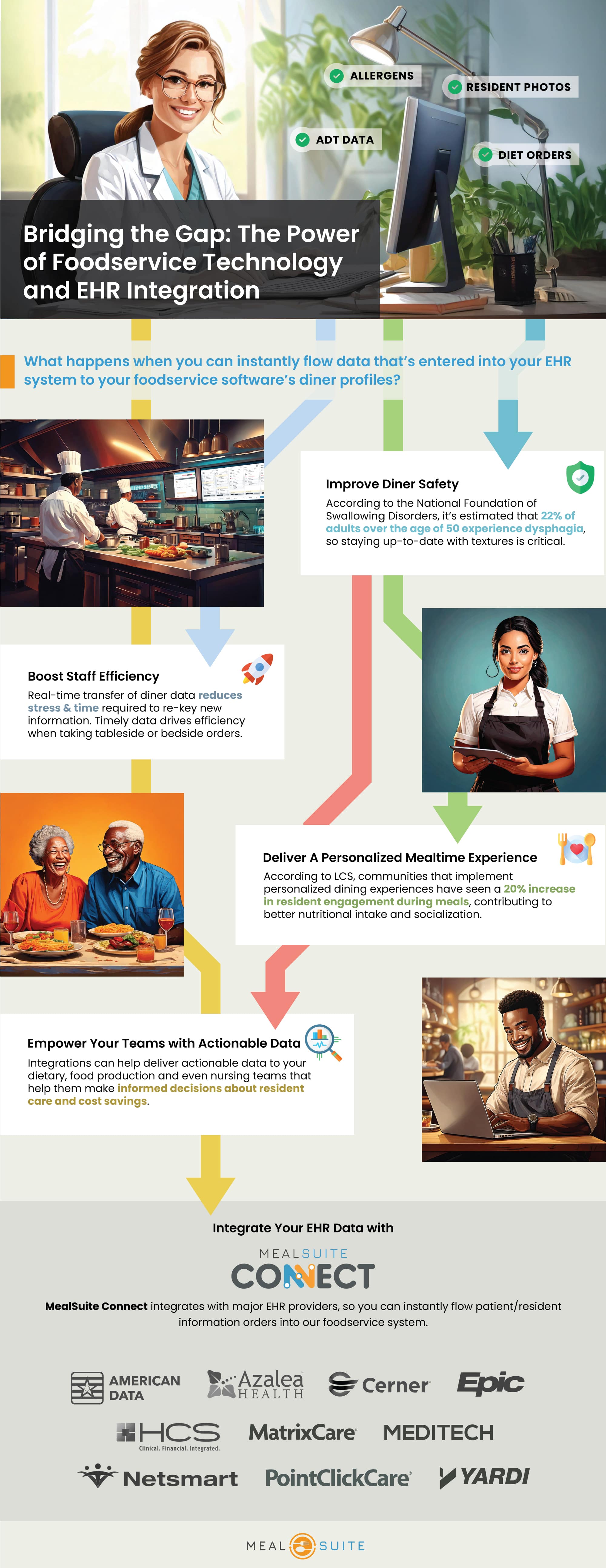 MealSuite Connect integrates with major EHR providers, so you can instantly flow patient/resident information into our foodservice system.